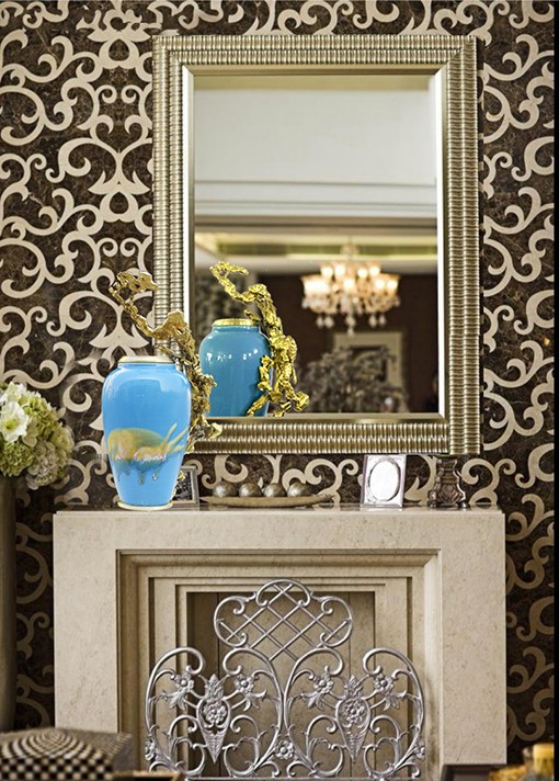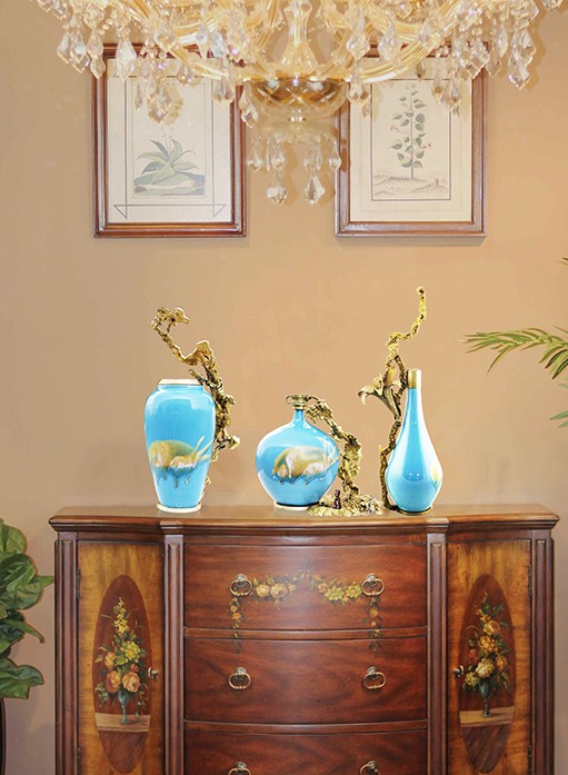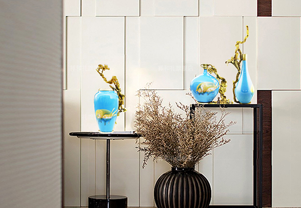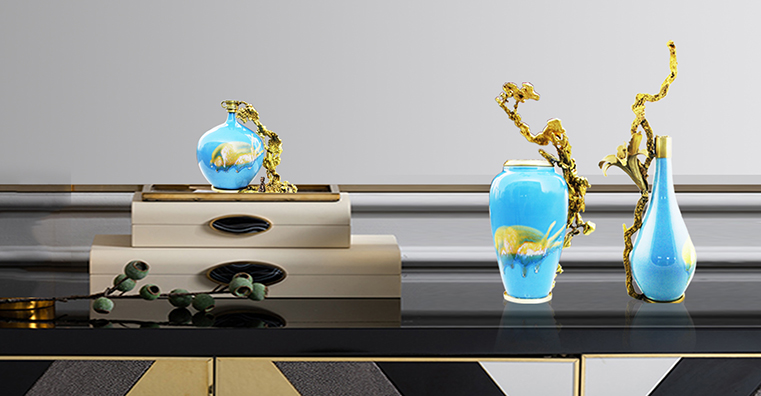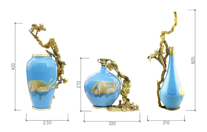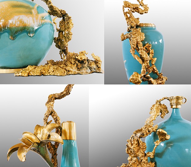 首先給彩瓷加了一個銅底座、銅沿口,然后把熔化后的銅水倒進(jìn)沙里,形成不同自然形狀后再與彩瓷底座和沿口相連,效果出人意料的好,厚重與輕脆相融,古樸與現(xiàn)代結(jié)合,也不知是瓷攀上了銅,還是銅纏上了瓷。相得益彰,妙不可言。