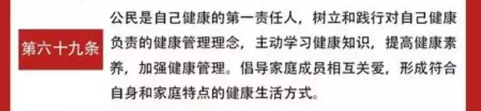 值得一提的是“倡導(dǎo)健康生活方式、倡導(dǎo)健康飲食習(xí)慣、加強(qiáng)健康管理……”等內(nèi)容被寫入法律?!督】捣ā返诹艞l:公民是自己健康的第一責(zé)任人,樹立和踐行對(duì)自己健康負(fù)責(zé)的健康管理理念,主動(dòng)學(xué)習(xí)健康知識(shí),提高健康素養(yǎng),加強(qiáng)健康管理。倡導(dǎo)家庭成員相互關(guān)愛,形成符合自身和家庭特點(diǎn)的健康生活方式。