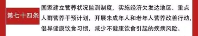 第七十四條:國家建立營(yíng)養(yǎng)狀況監(jiān)測(cè)制度,實(shí)施經(jīng)濟(jì)欠發(fā)達(dá)地區(qū)、重點(diǎn)人群營(yíng)養(yǎng)干預(yù)計(jì)劃,開展未成年人和老年人營(yíng)養(yǎng)改善行動(dòng),倡導(dǎo)健康飲食習(xí)慣,減少不健康飲食引起的疾病風(fēng)險(xiǎn)。