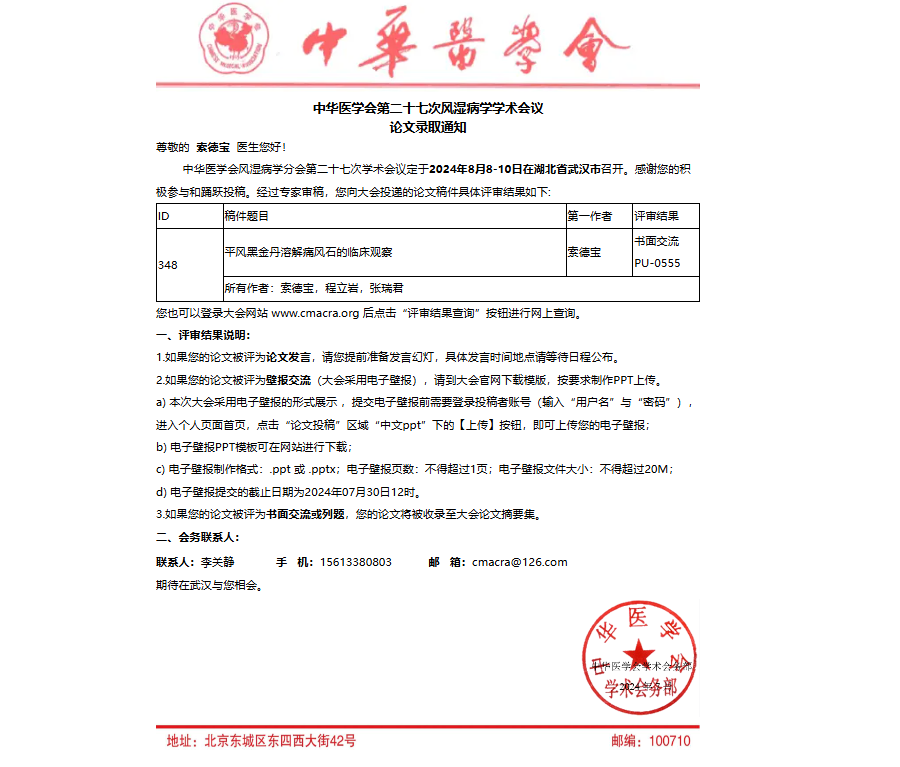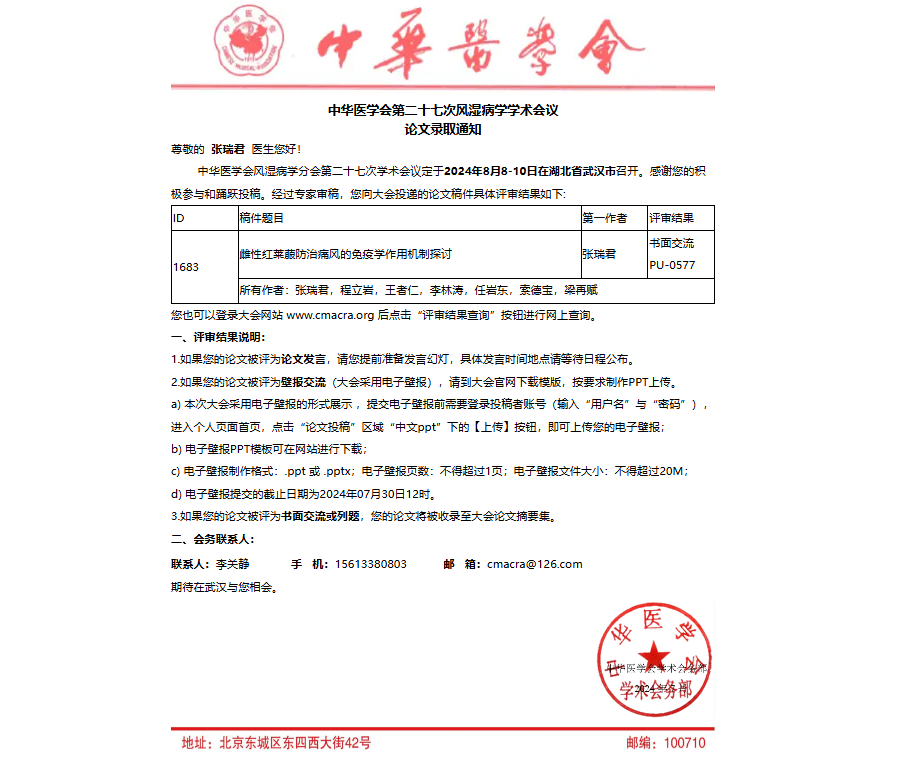 抗風(fēng)竤再迎里程碑式突破!我院兩篇論文成功被中華醫(yī)學(xué)會(huì)第二十七次風(fēng)濕病學(xué)學(xué)術(shù)會(huì)議收錄